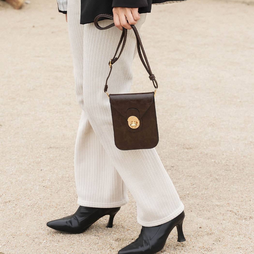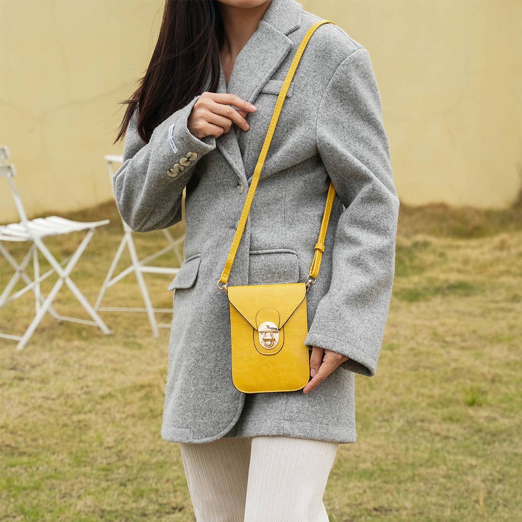 The Havana Phone Crossbody Bag is a stylish and functional accessory crafted from textured vegan leather. It features a sophisticated turn lock closure and gold-tone detailing. The bag offers versatility and a shoulder strap that is adjustable and removable. It has two compartments and a credit card slot for essentials. Measures 7.0" wide X 5.2" high X 1.0" deep.